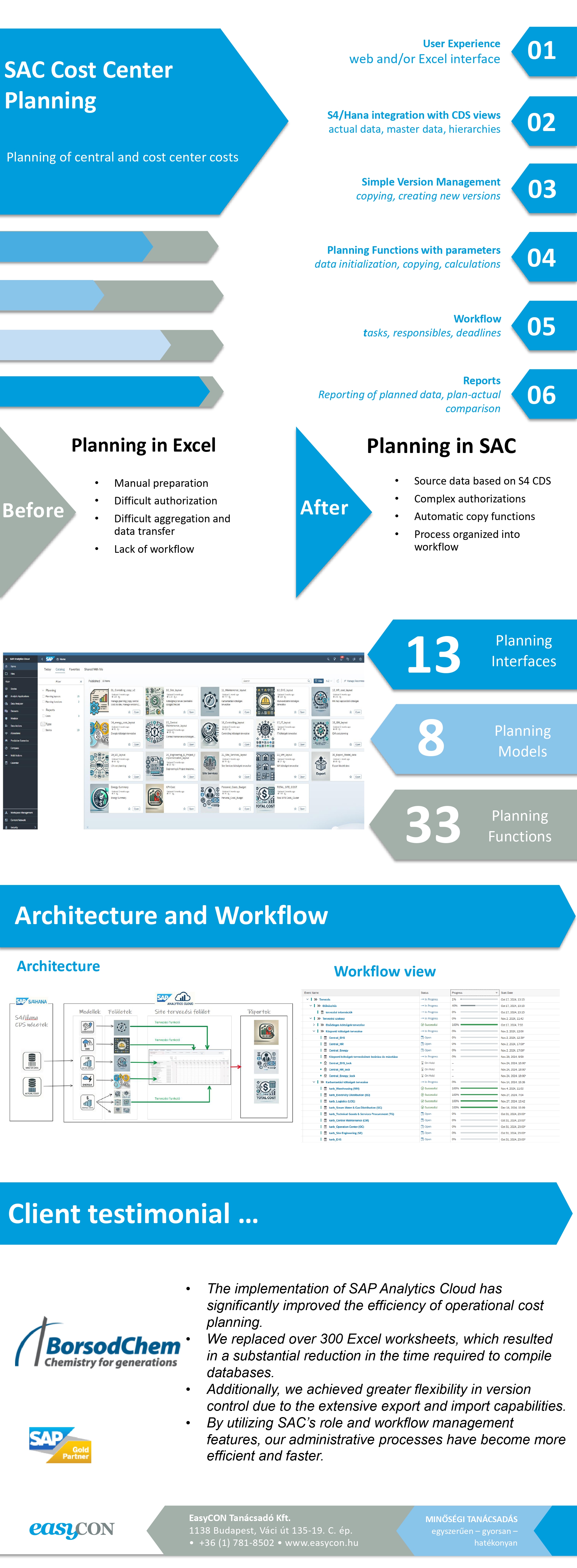 SAP Analytics Cloud is an all-in-one cloud-based product offered by SAP as a software-as-a-service for business intelligence (BI), enterprise planning and predictive analytics. The tool, implemented by EasyCON at BorsodChem Plc, provides a unified and secure cloud experience to maximize data-driven decision making by being SAP's cloud data visualization tool.